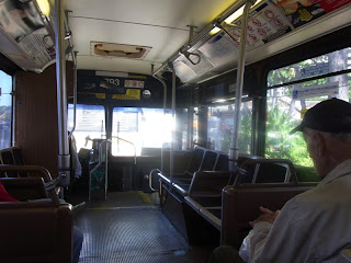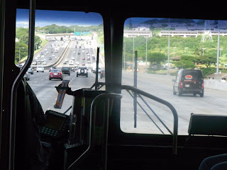 ★ バスの椅子はプラスティックだが、座り心地は悪くは無い。 車内のエアコンが例のごとくサービス過剰。でも現地の若い人でさえ長袖を引っ張り出し、羽織ったから 「 寒ければ自己防衛 」をと言う事か。 このバスは少々古く停留所のアナウンス・電光掲示が無く、それでも乗客は黙って合図の紐を引っ張り降車していく! - カメハメハ・ハイウェイを走行- 10:53
