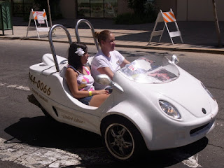 何のデモンストレーションだか不明? カラカウア通りのツアー客・リゾート客の視線を集めているのは確か! マアー、運転手・同乗者も車も皆可愛い!